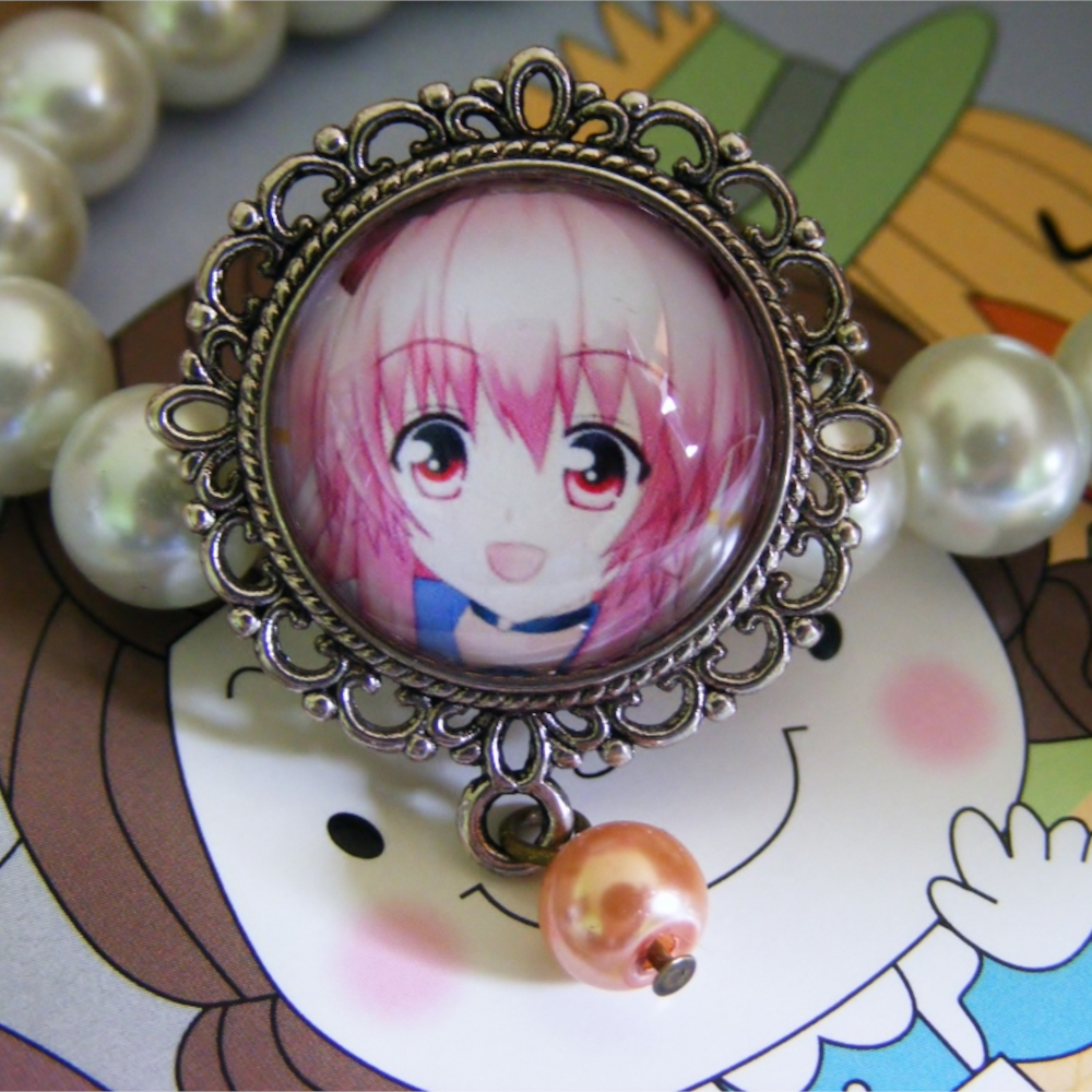 Urocza broszka z grafiką przedstawiającą postać w stylu anime girl z różowymi włosami, wykonana na ozdobnej bazie w kolorze srebra. Ilustracja została zabezpieczona szklanym kaboszonem, który pięknie podkreśla kolory i nadaje całości elegancki połysk. Dodatkową ozdobę stanowi perłowy koralik zawieszony u dołu broszki.