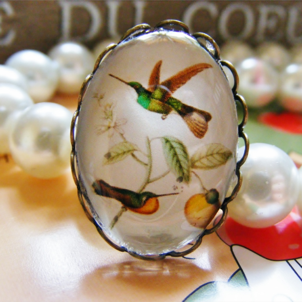 Broszka Ptak Oreopyra Cinereicauda to elegancka ozdoba w stylu vintage, idealna dla miłośników przyrody i biżuterii z duszą. Broszka przedstawia ilustrację dwóch kolibrów z gatunku Oreopyra Cinereicauda, otoczonych motywem roślinnym i owocami. Obrazek o wymiarach 18x25 mm został osadzony w dekoracyjnej oprawie w kolorze starego brązu i zabezpieczony wypukłym szklanym kaboszonem, który dodaje mu głębi i charakteru. To doskonały wybór na prezent lub dopełnienie romantycznej stylizacji retro.